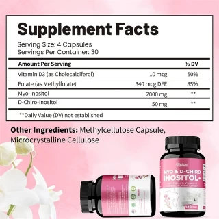 30 Day Supply - Recommended 4 Capsules Per Day - Ingredients: Myo Inositol 2000 mg D Chiro Inositol 50 mg Folic Acid 85% DV Vitamin D 50% DV - 100% Clean Label Ingredients - Zero Fillers or Additives - Vegan Capsules, No Dyes, Gluten Free, No Dairy Free, Soy Free.