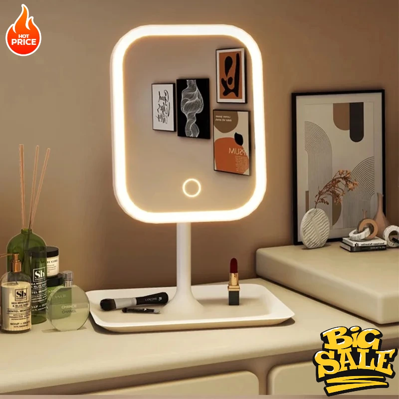 Product Introduction This smart LED smart mirror is a must-have for girls' bedrooms and students' dorm desks, combining both style and practicality. It features built-in surround lighting to create soft, even makeup lighting. With its refined square design and minimalist white finish, it complements various decor styles, serving as both a perfect makeup companion and a stylish desk accessory. The base includes a dedicated storage area, making it easy to store lipsticks and eyebrow pencils. Whether for daily makeup or touch-ups on the go, it handles everything effortlessly Product Features 1. Tri-color fill light + stepless dimming: 3 adjustable color temperatures (cool/warm/neutral), with freely adjustable brightness for more precise makeup application, eliminating color mismatch caused by poor lighting 2. Ultra-clear mirror + high-definition color display: The highly transparent mirror accurately captures your real makeup, with even lighting that avoids glare, ensuring clear visibility of details for a more refined makeup application 3. Free Rotation + Convenient Storage: The mirror body can rotate flexibly to adapt to various angles, and the base features a built-in storage area for easy organization of small items, keeping them tidy and clutter-free 4. Brightness Memory + Ultra Long Battery Life: Automatically restores last brightness setting upon next startup, lasts for extended periods with a single charge, and functions worry-free even during dormitory power outages 5. Portable and Versatile: Its compact design does not take up much desk space, while the minimalist white exterior suits various settings like bedrooms and dormitories, combining both aesthetic appeal and practicality