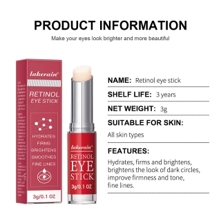 Product information Name: retinol eye stick Brand: lakerain Shelf life: 3 years Net weight: 3g Suitable for skin: all skin types Features: Hydrates, Firms and Brightens, Brightens the Look of Dark Circles, Improve Firmness and Tone, Fine Lines.